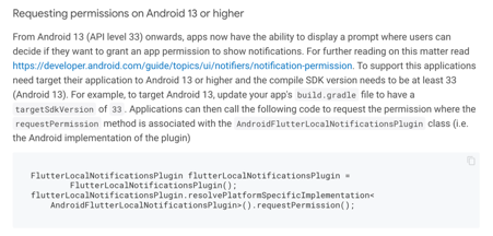 From Android 13 (API level 33) onwards, apps now have the ability to display a prompt where users can decide if they want to grant an app permission to show notifications. For further reading on this matter read https://developer.android.com/guide/topics/ui/notifiers/notification-permission. To support this applications need target their application to Android 13 or higher and the compile SDK version needs to be at least 33 (Android 13). For example, to target Android 13, update your app's build.gradle file to have a targetSdkVersion of 33. Applications can then call the following code to request the permission where the requestPermission method is associated with the AndroidFlutterLocalNotificationsPlugin class (i.e. the Android implementation of the plugin)