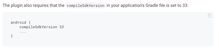 The plugin also requires that the compieSdkVersion in your application's Gradle file is set to 33: