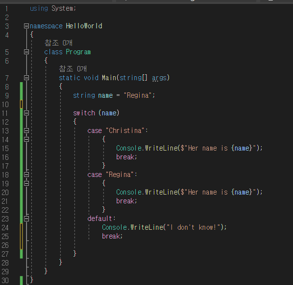Console.WriteLine($"Her name is {name}"); // 실행 O